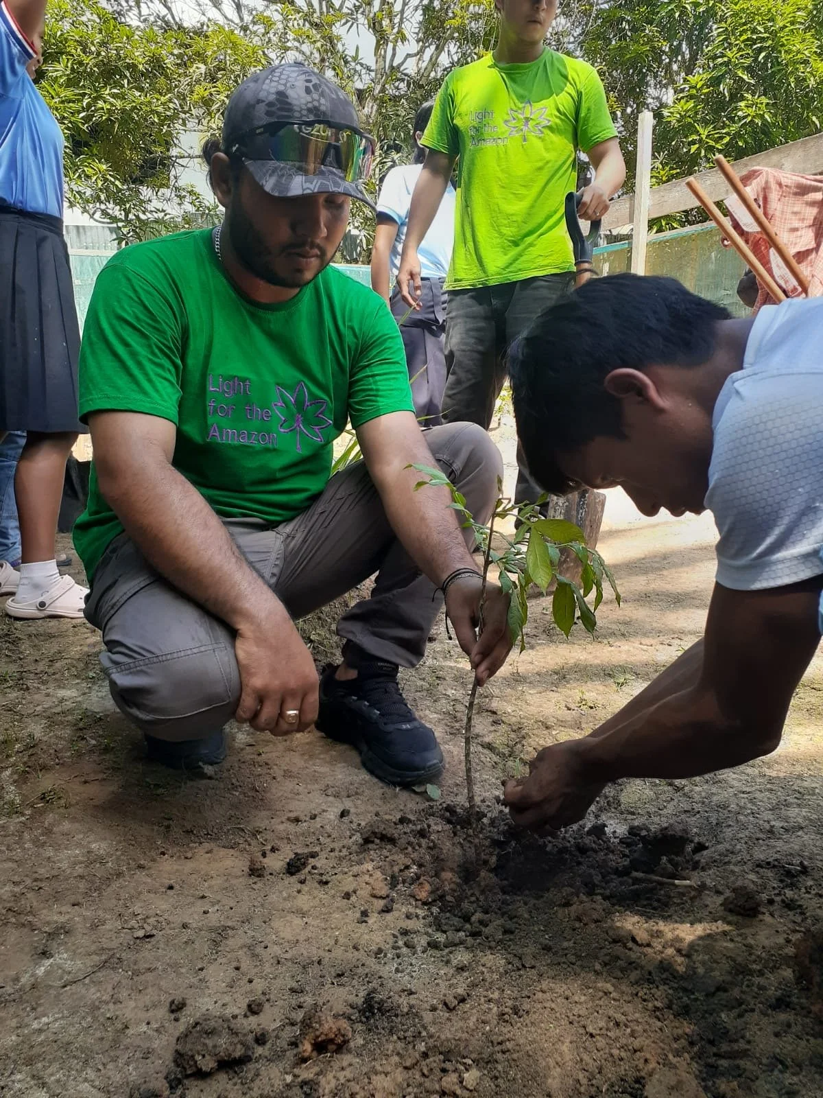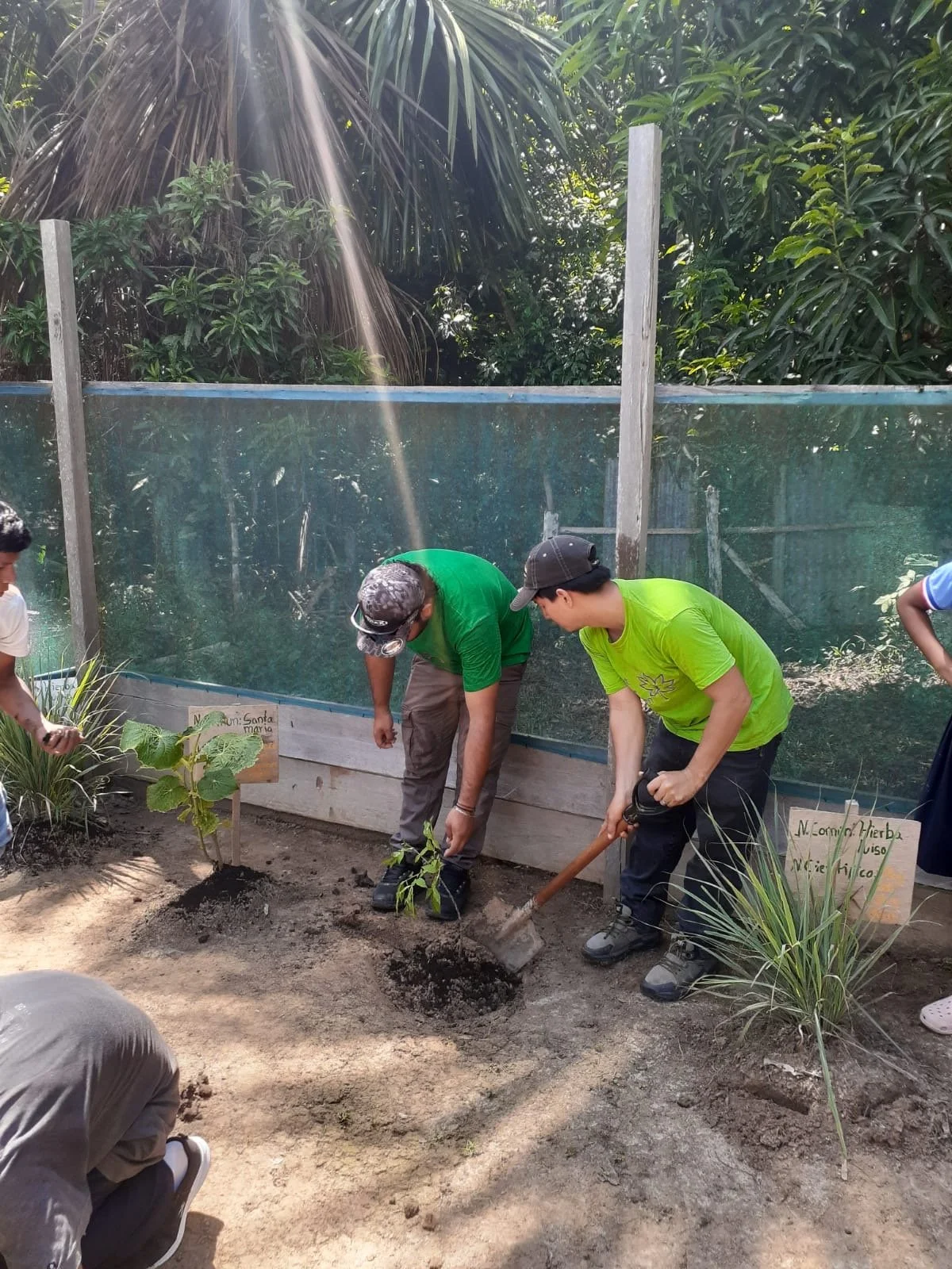 Students planting medicinal plants in the garden alongside our volunteers, Julio Cesar García and Ricardo Meza, both agroforestry engineers from UNAP University in Iquitos.